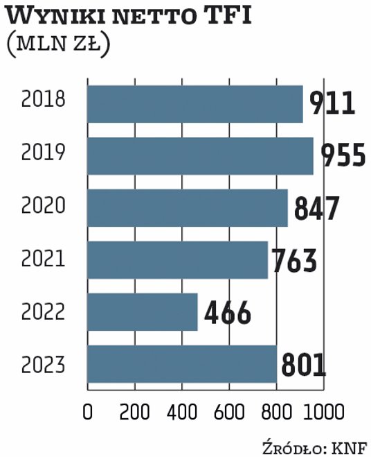Jak wynika z danych Komisji Nadzoru Finansowego, łącznie TFI zarobiły w 2023 r. 801 mln zł w porównaniu z 466 mln zł w roku 2022. Zysk za 2023 r. był też nieznacznie wyższy niż to, co TFI wypracowały w 2021 r. W samym IV kwartale 2023 r. towarzystwa wypracowały blisko 381 mln zł.