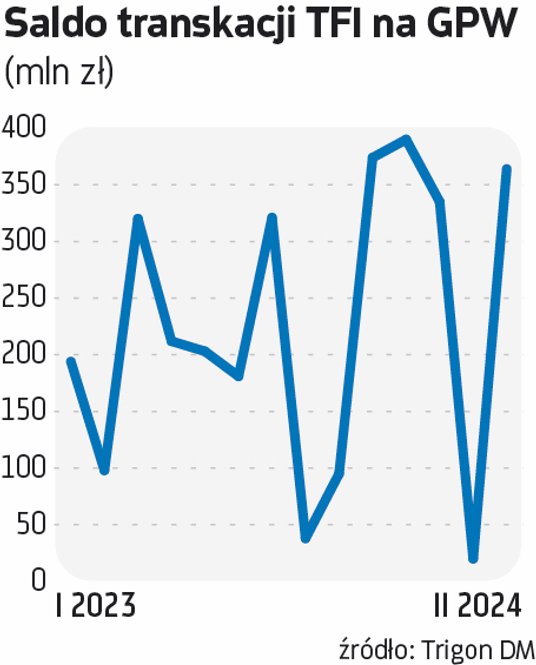 Na podstawie przepływów netto do poszczególnych kategorii funduszy inwestycyjnych Trigon DM wyliczył, że łącznie TFI kupiły w lutym akcje na GPW za około 364 mln zł. Był to wynik porównywalny z trzema ostatnimi miesiącami 2023 r. W styczniu zaś, w związku z przewagą umorzeń w funduszach polskich akcji, TFI wysupłały na krajowe spółki jedynie 20 mln zł.