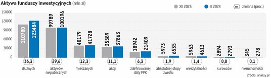 Marzec był kolejnym miesiącem wzrostu aktywów pod zarządzaniem towarzystw funduszy inwestycyjnych – tym razem przybyło im 6,7 mld zł (w tym 2,1 mld zł to efekt wyników zarządzania), co daje około 18,5 mld zł wzrostu kapitału pod zarządzaniem od początku roku – wynika z raportu Analizy.pl i IZFiA. Niezmiennie krajowy rynek funduszy wypychają do góry produkty dłużne, które z końcem marca odpowiadały za 36,4 proc. rynku (uwzględniając fundusze niepubliczne). W tego typu produktach klienci TFI utrzymywali aż 123,5 mld zł. W porównaniu z końcem minionego roku jest to wzrost o blisko 13 mld zł. Większość tej kwoty to jak na razie wpłaty klientów – w trzy pierwsze miesiące tego roku ulokowano w nich 10,8 mld zł świeżej gotówki. Swoje trzy grosze do zwyżki aktywów dorzuciły też wyniki zarządzania, choć w kwietniu ten czynnik może negatywnie oddziaływać na poziom aktywów, szczególnie funduszy obligacji długoterminowych.