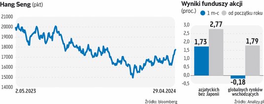 Przypomnijmy, że indeks giełdy w Hongkongu na początku roku przeżywał trudniejsze chwile, kontynuując spadki z ostatnich lat, a przez trzy lata z rzędu tracił po kilkanaście procent. Rajd z drugiej połowy kwietnia sprawił jednak, że Hang Seng wreszcie wydostał się powyżej zamknięcia 2023 r., a jego tegoroczna stopa zwrotu sięga już 4 proc. Co więcej, indeks ten w samym kwietniu notuje jeden z najlepszych wyników w gronie wszystkich głównych indeksów giełd na świecie.