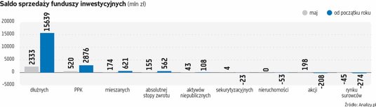 Przewaga wpłat do funduszy akcji zagranicznych była zaś śladowa. Maj był zatem czwartym z rzędu miesiącem z dodatnim wynikiem sprzedaży funduszy polskich akcji, aczkolwiek negatywne nastawienie klientów TFI do rozwiązań zagranicznych sprawia, że wynik sprzedaży po pięciu miesiącach najryzykowniejszych produktów jest nadal około 0,2 mld zł na minusie.