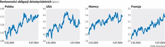 Igor Lenart z BNP Paribas TFI zakłada, że oprocentowanie amerykańskich papierów skarbowych utrzyma się na zbliżonych poziomach do tych z końca I półrocza. – Z jednej strony postępujące ochłodzenie amerykańskiego rynku pracy wraz z powoli słabnącą presją inflacyjną dają nadzieję na przynajmniej jedną obniżkę kosztu pieniądza za oceanem, co powinno kierować rentowności na południe. Z drugiej strony w przeciwnym kierunku będzie oddziaływać coraz bardziej realna wygrana Donalda Trumpa w listopadowych wyborach, co w opinii rynku przyniesie kolejny impuls fiskalny i podwyższy i tak wysoki dług USA – zauważa.