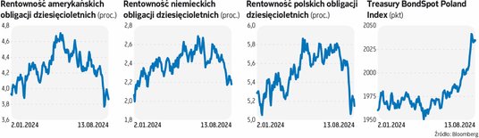 Spadki rentowności (wzrosty cen) papierów skarbowych rozpoczęły się około miesiąca temu, gdy nerwowo zaczęło być na rynkach akcji. Rentowność polskich obligacji dziesięcioletnich osunęła się z okolic 5,7 proc. do blisko 5 proc. Ostatnio wróciła zaś w okolice 5,2 proc. Podobnie zachowały się obligacje także innych krajów, w tym USA.