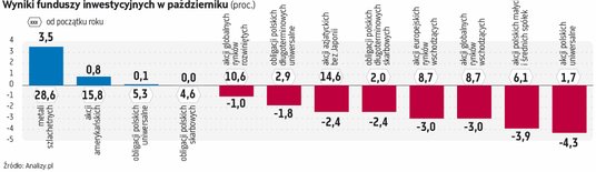 Dla fanów krajowego rynku akcji październik był trudnym miesiącem, ale z perspektywy globalnej zapisał się nie tak źle. Najlepszą tego typu kategorią okazały się fundusze akcji amerykańskich, które ogółem miesiąc kończyły na drugiej pozycji, z 0,8-proc. stopą zwrotu. Pozostałe kategorie funduszy akcji miały już wyniki ujemne, ale ogółem rynki rozwinięte wypadły wyraźnie lepiej od wschodzących.