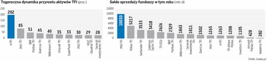 Po dziesięciu miesiącach tego roku aktywa krajowych funduszy inwestycyjnych są o ponad 15 proc. większe. Ogromna w tym zasługa popularności wśród klientów TFI funduszy dłużnych, szczególnie papierów krótkoterminowych, które zgodnie z założeniami są atrakcyjną alternatywą dla depozytów bankowych. Co ciekawe, aktywa funduszy inwestycyjnych wzrosły również w październiku, śrubując rekord. Jak jednak wyliczył serwis Analizy.pl, miesięczna dynamika przyrostu sięgnęła ledwie 0,1 proc. i był to najmarniejszy wynik od sierpnia poprzedniego roku. To oczywiście efekt pogorszenia sytuacji na krajowym rynku akcji i obligacji skarbowych. Inwestorów to jednak nie zraziło – w październiku do funduszy popłynęły kolejne miliardy złotych. Znów też pierwszym wyborem pozostawały fundusze krótkoterminowych papierów dłużnych, a jako ciekawostkę można potraktować dodatni wynik sprzedaży funduszy akcji polskich uniwersalnych.