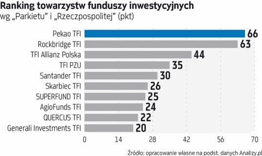 Czołowe towarzystwa plasowały się wysoko także w poprzednich edycjach. W tym roku walka rozstrzygnęła się między Pekao TFI (66 pkt z łącznych 480 pkt) i Rockbridge TFI (3 pkt mniej). Oba mogą się pochwalić wysokimi lokatami w poszczególnych grupach funduszy obligacji. Dodatkowo fundusze Rokcbridge przewijają się na punktowanych pozycjach także wśród funduszy akcji polskich, ale Pekao TFI ma w ofercie paletę mocnych funduszy dłużnych i to dało mu zwycięstwo.