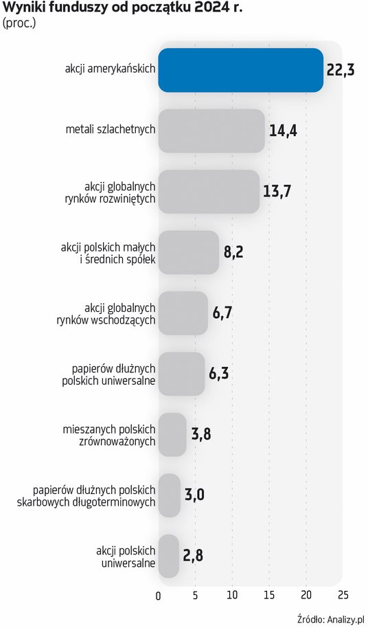 Fundusze obligacji to dobra baza wyjściowa, bo po tak mocnym dla amerykańskiego rynku akcji roku korekta byłaby wręcz czymś wskazanym. Czy jest to myślenie życzeniowe, okaże się, bo z pewnością wielu inwestorów będzie tylko czekać, by kupić akcje po niższych cenach – za rynkiem akcji (przede wszystkim amerykańskich) przemawia nadal mocna sytuacja gospodarcza za oceanem. – W trakcie roku zakładamy pojawienie się większych okazji na rynkach akcji czy metali szlachetnych. Obecnie amerykański rynek akcji jest drogi i panuje na nim nadmierny optymizm – ocenia Sebastian Buczek, prezes Quercus TFI. Znacznie większy komfort powinny dać jednak obligacje, dla których 2024 r. nie był tak dobry, jak oczekiwano 12 miesięcy wcześniej. Przy wciąż dość dobrej sytuacji gospodarczej ciekawym pomysłem pozostają obligacje korporacyjne. – Spodziewana w najbliższym czasie dalsza stabilizacja stóp procentowych w Polsce będzie wspierała stosunkowo wysoką rentowność zmiennokuponowych obligacji, zarówno skarbowych, jak i korporacyjnych. W tym drugim segmencie dalej obserwujemy interesujące transakcje na rynku pierwotnym, a oferowane marże kredytowe pozostają atrakcyjne – komentuje Bartosz Tokarczyk z Noble Funds TFI.