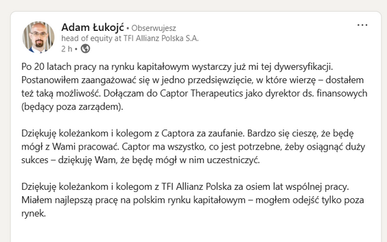 Łukojć poinformował, ze przechodzi do Captor Therapeutics. "Postanowiłem zaangażować się w jedno przedsięwzięcie, w które wierzę – dostałem też taką możliwość. Dołączam do Captor Therapeutics jako dyrektor ds. finansowych (będący poza zarządem)” - podał na portalu Linkedin.