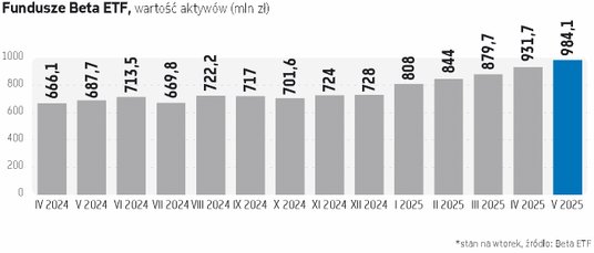 Obecnie na warszawskiej giełdzie notowanych jest 11 funduszy ETF, za którymi stoi Beta ETF. Pierwszy z nich zadebiutował na początku 2019 r. Aby więc zbliżyć się do 1 mld zł aktywów, potrzeba było ponad sześciu lat. Przedstawiciele firmy wierzą, że na kolejny miliard trzeba będzie czekać krócej.