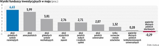 Po nerwowym na wielu parkietach kwietniu, maj przyniósł wyraźne umocnienie rynków akcji. Szczególnie mocne były Stany Zjednoczone, ale także i polskie spółki kontynuowały tegoroczną, dynamiczną wspinaczkę. Mniej kolorowo było z funduszami papierów długoterminowych.