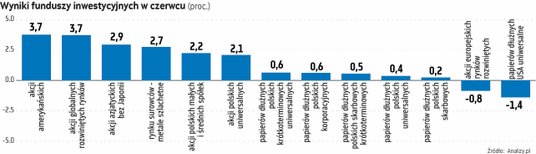 Czerwcowe wyniki funduszy inwestycyjnych wyglądają tak prosto jak tabliczka mnożenia. Najlepsze stopy zwrotu przyniosły akcje, w środku plasowały się fundusze mieszane, a dół tabeli zajęły na ogół fundusze dłużne. Czego chcieć więcej?
