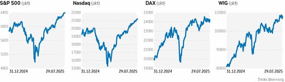 Pierwsze rynkowe reakcje po ogłoszonym w weekend porozumieniu handlowym między Stanami Zjednoczonymi a Unią Europejską wskazują, że inwestorzy odczytują je jako negatywne dla Europy. Optymiści zauważą, że warunki porozumienia nie są tak złe, jak początkowo straszył Donald Trump, ale pesymiści zwrócą uwagę, że 15-proc. stawka jest zdecydowanie wyższa od oczekiwań z początku tego roku. Tymczasem amerykański S&P 500 w poniedziałek osiągnął nowe maksima i jest około 30 proc. powyżej poziomu z tzw. dnia wyzwolenia. Najwyraźniej na razie inwestorzy bardziej żyją sezonem wyników. Podobnie silny w tym samym okresie jest niemiecki DAX, ale przypomnijmy, że w pierwszych miesiącach tego roku europejskie parkiety zachowywały się lepiej od Wall Street, a główny indeks niemieckiej giełdy od początku roku ma około 13 pkt proc. przewagi nad S&P 500. Inwestorzy mogą zastanawiać się, na ile ostatnie ustalenia okażą się trwałe, a przede wszystkim, jaki ostatecznie wpływ będą mieć na gospodarkę. Według Goldmana Sachsa negatywny wpływ taryf celnych na PKB USA zacznie być widoczny od około IV kwartału tego roku i osiągnie swoje apogeum na przełomie drugiego i trzeciego kwartału przyszłego roku, obniżając dynamikę wzrostu PKB o 1 pkt proc.