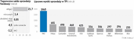 Z końcem lipca aktywa zgromadzone w towarzystwach funduszy inwestycyjnych sięgnęły 391,5 mld zł, co oznacza 2,5-proc. wzrost miesiąc do miesiąca. Aktywa rosną zarówno dzięki dobrym wynikom inwestycyjnym, jak też kolejnym miliardom złotych przenoszonych przez klientów głównie z depozytów do TFI. Tylko w lipcu napływy netto do funduszy detalicznych sięgnęły 5,8 mld zł, a wraz z funduszami dedykowanymi i pracowniczymi planami kapitałowymi wynik sprzedaży wyniósł 5,95 mld zł.