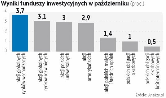 Niecałe 6 proc. krajowych funduszy inwestycyjnych w ubiegłym miesiącu przyniosło stratę. Największą – fundusz zyskujący na spadkach Nasdaqa, który w październiku wciąż był mocny, ale początek listopada przynosi zmianę nastawienia wobec amerykańskich akcji. W ostatnich tygodniach poprawiło się także nastawienie inwestorów do dolara i amerykańskich obligacji.