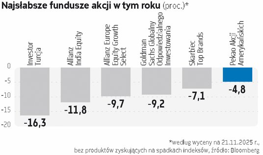 Z kilkuset funduszy akcji w tym roku około dziesięciu (nie licząc produktów mających zarabiać na spadkach indeksów) notuje ujemną stopę zwrotu od początku roku. Spora grupa natomiast zdołała zarobić marne kilka procent, podczas gdy średnie stopy zwrotu funduszy akcji są na ogół dwucyfrowe. Często jest to związane z mocnym złotym, a dokładniej – brakiem zabezpieczenia walutowego. Bywa jednak i tak, że gwiazdy lat poprzednich w tym roku prezentują się bardzo blado.