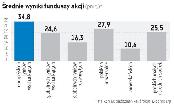 Listopad przyniósł co prawda korektę akcji, ale do końca października wszystkie główne, wyróżniane przez serwis Analizy.pl grupy funduszy akcji notowały średnio dwucyfrowe stopy zwrotu od początku roku. Co ciekawe, najsłabiej w tym gronie prezentowały fundusze akcji amerykańskich, mając na koncie średnio 10,6 proc. zysku, czyli zdecydowanie mniej od S&P 500, który w ciągu dziesięciu miesięcy wzrósł o 16,3 proc. Jeszcze mocniejszy był Nasdaq, a warto odnotować, że to właśnie on skupia najpopularniejsze amerykańskie firmy. Obecnie, czyli według wyceny funduszy z piątku, aż trzy produkty ze wspomnianej grupy mają od początku roku ujemne stopy zwrotu. Pekao Akcji Amerykańskich traci 4,8 proc., a Esaliens Spółek Innowacyjnych jest 2,44 proc. pod kreską. Tuż pod powierzchnią jest BNP Paribas Akcji Wzrostowych USA. Mało tego – spośród 15 funduszy tylko sześć ma jeszcze ponad 10-proc. wynik. Przyczyną słabszego na tle indeksów wyniku mogą być kwestie strategiczno-techniczne, czyli umocnienie złotego do dolara, które w tym roku sięga ponad 10 proc. Jak informuje Pekao TFI w przypadku wspomnianego funduszu występuje ryzyko walutowe, co może mieć wpływ na stopę zwrotu obliczaną w złotym. Na tę kwestię zwraca uwagę także Olaf Pietrzak z Esaliens TFI. – Umocnienie się PLN zabrało z wyniku ponad 11 proc. od początku roku – szacuje.