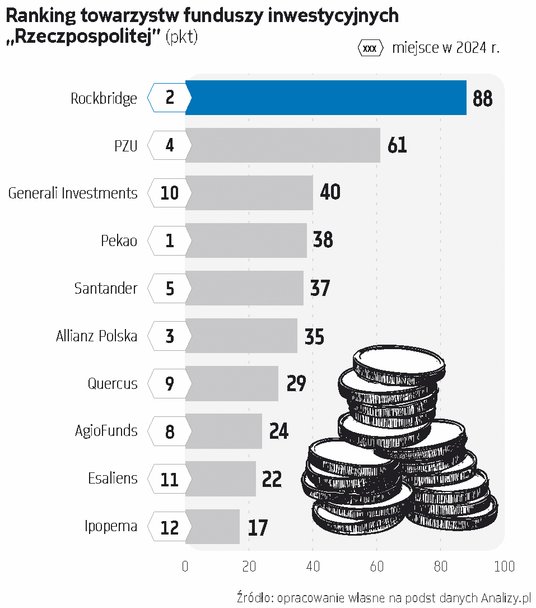 Nie powinno być zatem niespodzianką, że największe szanse na czołowe miejsce w rankingu mają towarzystwa, które czują się mocne w inwestycjach w obligacje, a jednym z takich jest Rockbridge TFI, które wygrywa klasyfikację w 2025 r. Co ciekawe, w roku ubiegłym to towarzystwo zajęło miejsce drugie, a to świadczy o powtarzalności wyników oraz słuszności naszej metodologii.