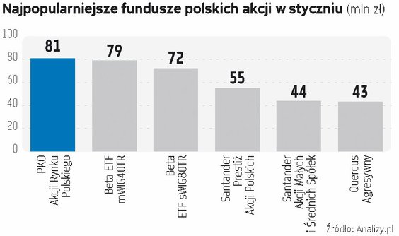 Z raportu serwisu Analizy.pl i Izby Zarządzających Funduszami i Aktywami wynika, że styczeń dla sektora TFI był rewelacyjny. Aktywa zgromadzone w funduszach inwestycyjnych powiększyły się w miesiąc o 15,3 mld zł, przekraczając na koniec stycznia 450 mld zł. Był to też drugi w historii branży TFI miesiąc pod względem nominalnego przyrostu aktywów. W miesiąc aktywa zwiększyły się o 3,5 proc., co daje też 16,1-proc. wzrost w 12 miesięcy. Rozpędzony rynek funduszy kontynuuje trendy z poprzedniego roku, aczkolwiek styczeń na kilku płaszczyznach był wyjątkowy. Po pierwsze w pierwszym miesiącu roku fundusze skierowane do inwestorów detalicznych pozyskały 8 mld zł netto, czyli najwięcej w historii krajowego rynku funduszy. Co prawda najwięcej kapitału powędrowało do funduszy dłużnych, przede wszystkim papierów krótkoterminowych, ale był to też bardzo mocny miesiąc dla funduszy akcji, do których trafiło 0,9 mld zł, co ciekawe – głównie polskich. Jeśli chodzi o napływy do funduszy polskich akcji, z sumy 0,62 mld zł wpłaty rozeszły się po około połowie pomiędzy fundusze uniwersalne oraz małych i średnich spółek. Co ciekawe, na czele listy popularności funduszy polskich akcji mamy głównie produkty indeksowe. Numerem jeden w styczniu był PKO Akcji Rynku Polskiego, działający jako otwarty fundusz indeksowy, natomiast na dwóch kolejnych lokatach uplasowały się fundusze z rodziny Beta ETF, odpowiednio odwzorowujące indeksy mWIG40 Total Return i sWIG80 TR. Działają one w formule FIZ-ów i notowane są na GPW.