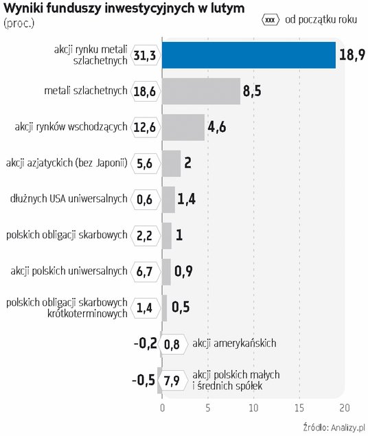 W lutym najlepiej radziły sobie fundusze spółek działających na rynku metali szlachetnych, przynosząc średnio niemal 19 proc. zysku. Połowę tego dały zarobić same metale szlachetne. Po dwóch miesiącach tego roku pierwsze notowały (średnio) ponad 31 proc. zysku, zaś drugie – niemal 19 proc. – wynika z danych serwisu Analizy.pl.