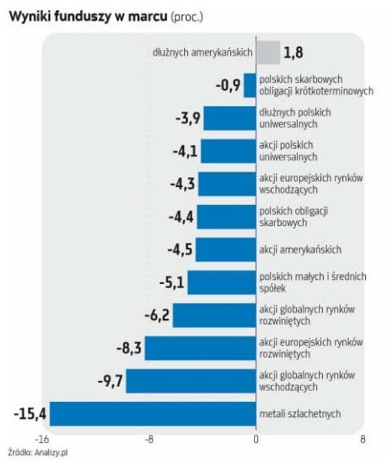Marcowe spadki funduszy dłużnych zmiotły kilkumiesięczne zyski, w tym zwłaszcza ze stycznia i lutego, które dla inwestujących w papiery skarbowe były bardzo dobre. Pod kreską znalazła się także większość funduszy akcji, aczkolwiek rynki wschodzące w Europie, w tym Polska, mają się wciąż nieźle. Mimo dwucyfrowych spadków w marcu fundusze metali szlachetnych oraz spółek z tego rynku również notują jeszcze dodatnie stopy zwrotu od początku roku.