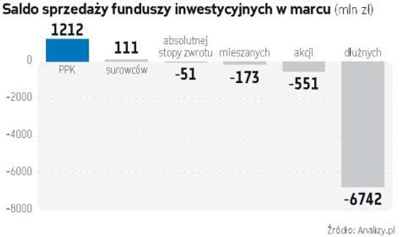 Jeśli chodzi o poszczególne produkty, to największe umorzenia zmuszony był obsłużyć PKO Obligacji Skarbowych Krótkoterminowy, zarazem najpopularniejszy fundusz ostatnich miesięcy, z którego w marcu uciekło 2,1 mld zł netto. Z PKO Obligacji Uniwersalnego wycofano 0,89 mld zł, a z Santandera Dłużnego Krótkoterminowego 0,54 mld zł. Wysokie odpływy odnotowały także fundusze obligacji korporacyjnych, z których klienci wypłacili 760 mln zł, w tym najwięcej z Generali Obligacji Krótkoterminowego.