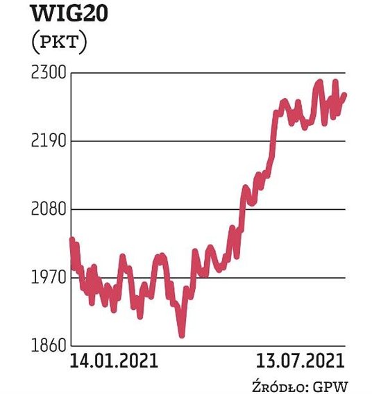 Wzrost był widziany już w poniedziałek, a jego dalszy ciąg mieliśmy we wtorek. Na starcie notowań WIG20 zameldował się 0,4 proc. nad kreską. Było to pokłosie m.in. kolejnych rekordów indeksów w Stanach Zjednoczonych, a także udanej sesji na rynkach azjatyckich. Po udanym otwarciu pojawiło się oczywiście pytanie: co dalej? Byki i niedźwiedzie początkowo nie bardzo wiedziały, jak rozegrać notowania. Po chwilowym impasie do ataku przystąpił popyt. WIG20 w pewnym momencie zyskiwał nawet około 0,8 proc. i coraz więcej znaków wskazywało na to, że wtorkowa sesja może również zakończyć się wzrostem. Warto przy tym zauważyć, że nasz parkiet należał tego dnia do jednego z najmocniejszych na Starym Kontynencie. Druga część dnia to tradycyjne oczekiwania na początek notowań na Wall Street. Tym razem doszły jednak do tego dane z amerykańskiej gospodarki, które pokazały, że inflacja jest tam już wyraźnie powyżej 5 proc. To znowu podgrzewa dyskusję o początku zacieśniania polityki pieniężnej przez Rezerwę Federalną. Chwilowo schłodziło to nastroje zarówno na Wall Street, jak i na GPW, gdzie WIG20 zaczął oddawać poranny wzrost. Kiedy jednak pierwszy szok minął, wszystko zaczęło wracać do normy. Indeksy w Stanach Zjednoczonych zaczęły znowu śrubować historyczne rekordy, a i kolor zielony mocniej zaczął świecić na warszawskim parkiecie. Tej sesji nie dało się już popsuć. W ostatecznym rozrachunku WIG20 zyskał 0,4 proc. i powoli zbliża się znów do psychologicznego poziomu 2300 pkt. Brakuje mu do niego 36 pkt. ¶