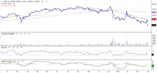 Tuż po 12.00 WIG20 rósł o 0,1 proc. do 1944,5 pkt, a więc przebywał w środkowym obszarze średnioterminowej konsolidacji. W jego portfelu największym ciężarem pozostał CD Projekt, tracący 11,5 proc. przy obrocie sięgającym prawie 400 mln zł. Inwestorzy nie są zadowoleni z podanej wczoraj przez spółkę strategii i ogłoszonych planów. Poranne minimum wynosiło po południu 181,5 zł, ale po południu kurs wrócił do 193 zł. Trwa walka między "łapaczami noży", a sprzedającymi... Skromny dorobek WIG20 nie wyróżnia się dziś na tle zagranicy. Przykładowo, zmiany DAX, BUX czy CAC40 nie przekraczały w tym samym czasie 0,2 proc. Niewykluczone, że powoli wchodzi w świąteczną atmosferą, a ta lubi sprzyjać wstrzymywaniu się z poważniejszymi decyzjami inwestycyjnymi. Z drugiej strony dziś ostatnia sesja miesiąca i kwartału, więc niewykluczone, że w drugiej połowie dnia zmienność jednak się pojawi.