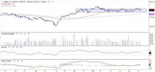 Notowania kontraktów futures na europejskie indeksy są lekko pozytywne nawet pomimo przypominającej Angei Merkel o emeryturze kompromitacji CDU w wyborach regionalnych w Badenii-Wirtembergii i Nadrenii oraz dołączeniu Irlandii do listy państw, które wstrzymują szczepienia preparatem Astra-Zeneca z powodu obaw o skutki uboczne. Poranne sugestie są jednak drugorzędne wobec ryzyk związanych z rynkiem długu. Po silnym ubiegłotygodniowym odbiciu NASDAQ wydaje się dojrzewać do drugiej fali spadkowej, która może mieć tym razem większy wpływ na resztę świata, który w przypadku pasywności Fed w tym tygodniu będzie musiał dostosować się do perspektywy silnego dolara. Do środy wieczorem rynek mogą więc czekać turbulencje. Sami pozostajemy ostrożnie optymistyczni jeśli chodzi o przebieg posiedzenia. Choć faktycznie warunki do ogłoszenia kontroli krzywej mogą się okazać obecnie niespełnione, po ubiegłotygodniowym posiedzeniu EBC wydaje nam się, że FOMC będzie chciało w jakiś sposób zahamować wzrost kosztów długu w USA.