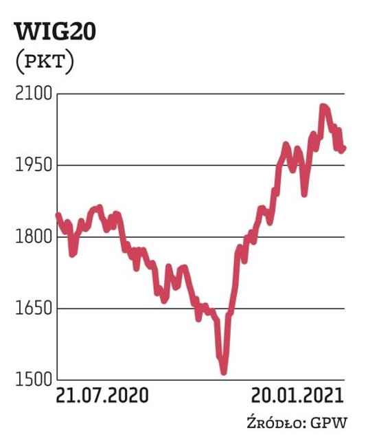 Jednak zwyżki te nie zostały utrzymane do końca sesji, która zakończyła się spadkiem poniżej 2000 pkt. Atmosfera na innych europejskich rynkach nie była zbyt dobra, natomiast akcje amerykańskie głównie zyskiwały na wartości. Środa na europejskich giełdach zaczęła się już jednak od zwyżek, natomiast WIG20 miał problem z utrzymaniem tempa na innych europejskich rynkach. Kupujący podjęli starania przebicia 2000 pkt, jednak nie zdołali pójść za ciosem. Ostatecznie WIG20 finiszował ze zwyżką około 0,3 proc., plasując się w połowie stawki. Chwilami zaś był najniżej od końcówki grudnia. Zdecydowanie lepiej wypadł niemiecki DAX. Z kolei na Wall Street obserwowaliśmy zwyżki o ponad 1 proc. Inwestorzy z optymizmem witali nowego prezydenta Joe Bidena.
