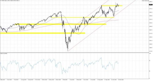 Nastroje na początku tygodnia wsparły lepsze od oczekiwań dane PMI, które sugerują, że koniunktura gospodarcza podczas jesiennej fali pandemii utrzymuje się na relatywnie wysokim poziomie. Szczególnie można wyróżnić tu sektor przemysłowy, ale w USA usługi również wyglądają dobrze. Wczorajsze wstępny wskaźnik PMI obrazujący kondycję w tym sektorze wzrósł w listopadzie do 57.7 pkt. z 56.9 pkt. odnotowanych w październiku. Dla przemysłu zaś osiągnął wartość 56.7 pkt. wobec 53.4 pkt. przed miesiącem. Nie tylko jednak relatywnie dobra koniunktura skłania obecnie inwestorów do kupowania akcji. Można wymienić tu również rozpoczęcie procesu przekazywania władzy w USA po przegranej Trumpa w wyborach prezydencjach, wobec czego można było mieć wątpliwości, czy informacje o nominacji na stanowisko sekretarza skarbu byłej szefowej Fed Janet Yellen. Perspektywa coraz bliższego rozpoczęcia szczepień w USA powinna, również sprzyjać byczo nastawionym inwestorom. Dziś uwagę w kalendarium należy zwrócić na listopadowy odczyt Conference Board odzwierciedlający jak wygląda sytuacja amerykańskich gospodarstw domowych w mijającym miesiącu. Mediana prognoz rynkowych wskazuje na spadek wskaźnika do 98.0 pkt. z 100.9 pkt. w październiku. Pozytywna niespodzianka w tym wymiarze również powinna być pozytywnie odczytywana.