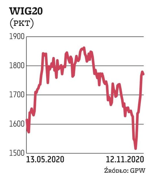 WIG20 zaczął od zwyżki do dziennego maksimum 1791 pkt, ale bliskość okrągłego poziomu skutecznie odstraszyła kapitał. Tuż po godz. 10 indeks spadł do dziennego minimum 1761 pkt, by później do końca handlu stabilizować się w okolicy poziomu poprzedniego zamknięcia. W tej stabilizacji mogły pomóc dane Ministerstwa Zdrowia dotyczące liczby zakażeń koronawirusem. Poprzedniej doby przybyło ich 22 683. To wciąż wysoka liczba, ale wyraźnie niższa niż ostatnie rekordy, co zwiększa szanse na wyhamowanie drugiej fali epidemii, a tym samym zmniejsza ryzyko pełnego lockdownu. WIG20 zakończył dzień spadkiem o 0,44 proc., a więc po siedmiu wzrostowych sesjach z rzędu w końcu znalazł się pod kreską. Trzeba przyznać, że skala spadku byłaby większa, gdyby nie sektor bankowy. Wszystkie banki wchodzące w skład portfela blue chips zanotowały zwyżki. Niestety, trzeci dzień z rzędu obciążeniem dla WIG20 było Allegro. Akcje potaniały w czwartek 3,9 proc. i kosztują już 78,5 zł.