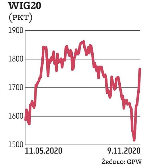 Po południu pojawiły się pozytywne informacje w sprawie prac nad szczepionką przeciwko Covid-19, które rozbudziły wyobraźnię inwestorów. Indeksy poszybowały w górę z dawno niewidzianą siłą. WIG20 zyskiwał ponad 4 proc., a niemiecki DAX był jeszcze mocniejszy. W kolejnych godzinach nieco się uspokoiło, natomiast w końcówce indeksy powróciły niedaleko dziennych maksimów. WIG20 sięgał blisko 1766 pkt, co przekładało się na zwyżkę o 4,02 proc. DAX z kolei na finiszu rósł o 4,7 proc. Za oceanem S&P 500 na początku sesji zbliżał się do 2,5-proc. zwyżki.