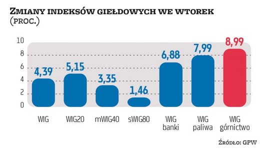 To była sesja marzenie. Od początku wtorkowych notowań na warszawskim rynku karty rozdawał popyt. Inwestorzy zachowywali się tak, jakby zapomnieli o drugiej fali koronawirusa, a także niepewności dotyczącej wyniku wyborów prezydenckich w Stanach Zjednoczonych. Mieliśmy prawdziwy pęd ku akcjom. Wynik tej gonitwy był imponujący. WIG20 zyskał ostatecznie 5,15 proc., co okazało się najlepszym wynikiem w Europie. Aż cztery spółki wchodzące w skład tego indeksu zanotowały dwucyfrowy wzrost. Liderem zestawienia okazało się LPP. Akcje tej firmy zyskały prawie 16 proc. Wzrost, chociaż nie tak mocny, zanotowały też średnie i małe spółki. mWIG40 zyskał 3,35 proc., a sWIG80 1,5 proc. Wszystko to okraszone zostało wysokimi obrotami, które wyniosły niemal 1,5 mld zł. To tylko wzmacnia wydźwięk wtorkowych zwyżek.