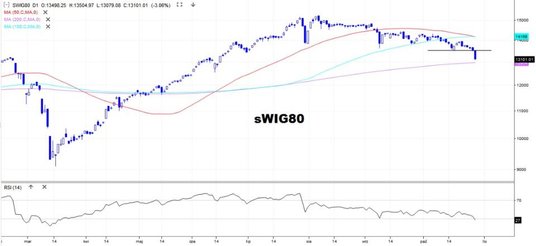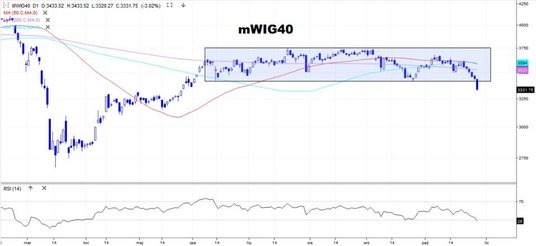 Dziś z GPW ucieka nie tylko zagraniczny kapitał. Krajowi inwestorzy też robią odwrót, o czym świadczą nowe, lokalne minima na mWIG40 i sWIG80. Pierwszy dotarł w porywach do 3320 pkt (najniżej od 25 maja), a drugi do 13 079 pkt (najniżej od 16 czerwca). Nowe dołki stanowią sygnały do kontynuacji wyprzedaży. W gronie średniaków najsłabsze były Biomed Lublin i PlayWay, ze stratami przekraczającymi 6 proc. Wśród maluchów aż sześć spółek notowało spadek kursu akcji przekraczający 8 proc., w tym m. in. Work Service, Airway i Harper. Silną wyprzedaż widać też na małym parkiecie. Wskaźnik NCIndex tracił o 13.00 aż 7,4 proc. Największe obroty, przekraczające 1 mln zł, były na 4MASS (-14,7 proc.), Biomaxima (-6 proc.), Farm51 (-10,6 proc.), Columbus Energy (-10,4 proc.), Blirt (-13,2 proc.) oraz CSY (-19,5 proc.).