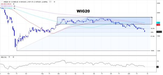 Nowy rekord zakażeń koronawirusem w Polsce (+18 820 przypadków), nasilające się protesty antyrządowe, słabe nastroje na parkietach regionu (DAX -3,5 proc., CAC40 -3,2 proc.) i przesunięcie premiery Cyberpunka to cztery główne powody dzisiejszych spadków na GPW. WIG20 znalazł się przed południem na poziomie 1571 pkt. To najniższy pułap od połowy maja i nowy dołek trwającego od sierpnia trendu spadkowego. Od szczytu "covidowej hossy" indeks stracił już ponad 16 proc. i dominacja podaży przybiera na sile. Na półmetku środowej sesji aż osiem spółek z WIG20 traciło po ponad 4 proc., z liderami spadków – CD Projektem (-5,8 proc.) i JSW (-7 proc.). Na plusie był tylko Play (+0,08 proc.). Warto zwrócić uwagę, że dzisiejsze minimum na WIG20 oznacza, że zrealizował się zasięg wynikający z wybicia dołem z wakacyjnej konsolidacji (1884-1735 pkt). Ponadto przy 1570 pkt znajduje się 50-proc. zniesienie marcowo-lipcowej fali wzrostowej, więc indeks wkroczył właśnie w ważną strefę wsparcia. Byki mają więc techniczny pretekst do odbicia, ale pytanie, czy w obliczu niesprzyjających warunków uda im się go wykorzystać?