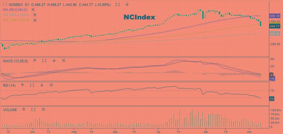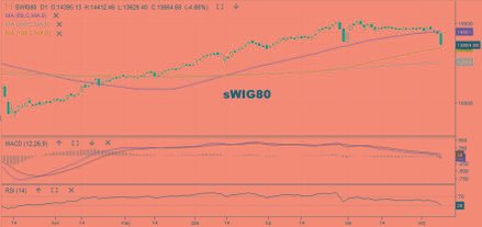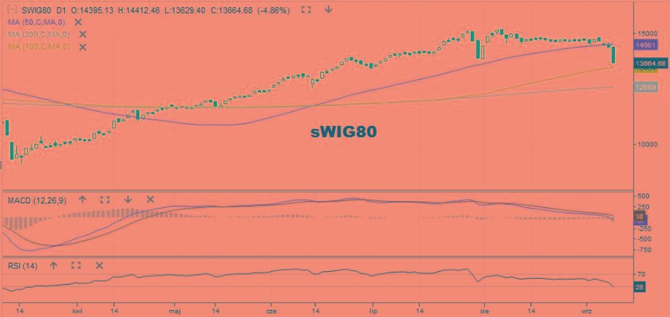 Zdecydowanie najsłabiej wygląda dziś trzecia linia GPW. Indeks sWIG80 spadał po południu o 4,9 proc. do 13 664 pkt. To najniższy poziom od początku lipca. Kurs przebił już 50-sesyjną średnią i zbliża się do 100-sesyjnej (13 465 pkt). Co więcej – ponad 10-proc. stratą notował w tym czasie NCIndex. Od szczytu z 29 lipca jego kurs oddalił się już o prawie 30 proc. Kurs testuje już średnią ze 100 sesji, a MACD jest poniżej 0. Z drugiej strony możliwość odbicia sygnalizują RSI (14) będący w strefie wyprzedania i towarzyszące zniżce coraz mniejsze obroty.