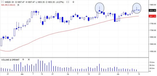 1:0 dla dziennej dwusetki – tak można skwitować czwartkową sesję, podczas której WIG20 po ponad dziewięciu miesiącach ponownie zaatakował kluczową granicę wyznaczającą linię pomiędzy hossą a bessą w długim terminie. W listopadzie 2019r. byki zostały wypuszczone na nowe maksima, jednakże zamiast triumfalnego zwycięstwa, doszło do porażki zwolenników hossy i wraz z pojawieniem się układu typu FAKE, niedźwiedzie zaczęły zbierać swoje żniwa. Wczoraj indeks blue chips wspierany przez otoczenie zewnętrzne, na chwilę przebił MA200_d, jednakże chętnych do grania długich pozycji nie było zbyt wiele i w ostateczności WIG20 zakończył sesję dwa oczka powyżej otwarcia. Co to oznacza dla byków? Skoro na dziennym wykresie pojawiła się formacja spadającej gwiazdy z cieniem zachodzącym na dzienną dwusetkę, to ursusy mają pretekst do tego, aby wykorzystać lokalną słabość byków i przypuścić frontalny atak w postaci zasypania akcjami karnet spółek z WIG20? Czwartkowa formacja spadającej gwiazdy, wraz z lipcowym tworem nagrobka doji, tworzą podwójny szczyt, będący z punktu widzenia klasyki AT oznaką słabości popytu. Wprawdzie wczorajsze zachowanie się WIG20 może stanowić pretekst do realizacji zysków ostatnich tygodni, jednakże sprzyjające otoczenie zewnętrzne nie pozwala ursusom na spokojne planowanie podażowych ataków. Zagraniczne indeksy nadal są silne, aktywa z bezpiecznej przystani zdają się potwierdzać proces risk-on zaś apetyt na polską walutę wskazuje pozytywną tendencję wspierająca dalszą zwyżkę warszawskich indeksów. Jednakże po wczorajszej sesji nadal brakuje twardych argumentów na korzyść kontynuacji hossy nad Wisłą, gdyż WIG20 odbił się od ruchomego oporu, EURPLN nadal się konsoliduje zaś mWIG40 toczy niekończącą się walkę z zeszłorocznymi minimami. Z jednej strony dominuje popyt, jednakże z drugiej podaż nie pozwala o sobie zapomnieć, przez co akcyjne byki mogą czuć się zakłopotane w dalszym marszu na północ...