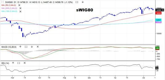 Notowania sWIG80 wyraźnie zawracają spod maksimum trendu przy 15 200 pkt i na wykresie klaruje się formacja podwójnego szczytu. Wygląda na to, że kurs zmierza w kierunku średniej kroczącej z 50 sesji (14 000 pkt), która podczas wcześniejszej korekty skutecznie wyhamowała atak podaży.