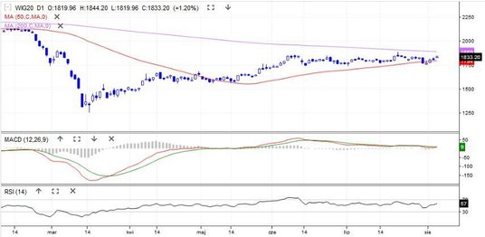 Optymistyczne odczyty usługowych PMI dla europejskich gospodarek, zwyżki DAXa i wzrostowe otwarcie sesji na Wall Street pozwoliły wygrać bykom środową sesję na warszawskim parkiecie. WIG20 wzrósł o 1,2 proc. do 1833 pkt i zanotował czwarty, wzrostowy dzień z rzędu. Czarna świeca z 30 lipca została tym samym zakryta. Notowania indeksu wróciły nad średnią z 50 sesji i okrągły poziom 1800 pkt. Jednocześnie oscylator MACD zakręcił w górę nad linią 0, a RSI(14) rośnie w strefie neutralnej. Analiza techniczna znów jest po stronie popytu, co zwiększa prawdopodobieństwo ruchu do szczytu trendu, czyli 1884 pkt.