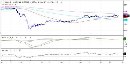 Do zeszłorocznego denka pozostało już niewiele a biorąc pod uwagę zmienność panującą obecnie na rynku walutowym istnieje szansa na to, że cross USDPLN przetestuje kilkunastomiesięczne minima. Tempo umacniania się złotego względem dolara jest najmocniejsze od wielu lat a obserwowany szturm zagranicy na PLN sprawia, że rośnie także presja na aprecjację WIGu. Wczoraj indeks szerokiego rynku powrócił nad dzienną dwusetkę a tym samym zmniejszone zostało ryzyko pułapki hossy, której pojawienie się na podwójnym szczycie i w ramach elliottowskiej pięciofalowej struktury, zaczęło niepokoić optymistów. Hamulcem dla akcyjnych byków nadal są banki, których ciężar spowolnił lokalne podbicie WIG20 o chociaż indeks ten zamknął się na plusie, to jednak widmo dalszej deprecjacji finansowych tuzów negatywnie wpływa na możliwości indeksu blue chips.