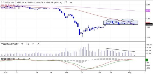 W pierwszej połowie dzisiejszej sesji zakres zmienności WIG20 rozciągał się od 1559 pkt do 1584 pkt. Notowania, o czym wspominałem w porannym komentarzu, bronią dolnej granicy trwającej od miesiąca konsolidacji. W ramach tej ostatniej kurs porusza się między 1570 i 1680 pkt. Na razie górą są byki. Na półmetku sesji indeks rósł bowiem o 0,6 proc. do 1578 pkt. Pomagają mu niewątpliwie nastroje na zagranicznych parkietach: DAX i CAC40 rosły o 0,8 proc., a kontrakty na S&P500 o 1,4 proc. Z porannego pogorszenia nastrojów wywołanego słabymi danymi o niemieckiej produkcji przemysłowej udało się więc wydostać. W ujęciu globalnym rynkom akcji pomaga ropa naftowa. Baryłka WTI po spokojnym starcie dnia, wczesnym popołudniem drożała o 8 proc. do 26 USD. Lekko w górę, o 0,5 proc. do 1693 USD, drożało złoto. Notowania głównej pary walutowej – EUR/USD, były stabilne i wahały się przy 1,0788 USD.