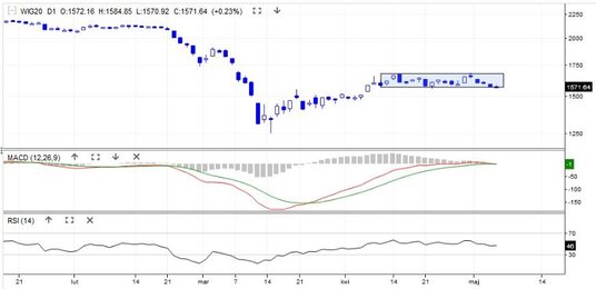 Wczoraj S&P500 spadł o 0,7 proc., ale Nasdaq zyskał 0,5 proc. Z kolei dziś Nikkei 225 finiszował 0,3 proc. nad kreską, ale Hang Seng spadł o 0,4 proc. Można więc powiedzieć, że przed startem sesji nastroje były neutralne. Na plus działać mogły lepsze od oczekiwań dane o bilansie handlowym Chin (eksport znacznie wyższy od prognoz), a także zgodne z oczekiwania bezrobocie w Szwajcarii. Na minus natomiast poranny odczyt produkcji przemysłowej w Niemczech, która w marcu spadła r/r o 11,6 proc. (prog. -8,9 proc.). Wypadkową tych wszystkich danych jest spokojne, ale wzrostowe otwarcie w Europie. DAX i CAC40 zyskiwały rano po 0,4-0,5 proc., a WIG20 nawet 0,95 proc. Nasz indeks próbuje wykorzystać dolną granicę trwającej o połowy kwietnia konsolidacji (ok. 1570 pkt), by odreagować cztery sesje pod kreską. Indeksy mWIG40 i sWIG80 też zaczęły na plusie, odpowiednio 0,4 proc. i 0,5 proc. Złoty lekko, bo o 0,2 proc., umacniał się rano do euro i dolara, a rentowności 10-latek rosły do 1,539 proc.