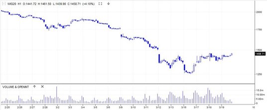 W końcową fazę sesji nasz rynek akcji wkroczył z przytupem. WIG20 rósł o ponad 4 proc. i wyznaczył sesyjne maksimum. Tym samym kontynuowana jest faza odbicia, obserwowana od 16 marca. Na ten moment wyzwaniem technicznym dla popytu jest luka rozciągająca się między 1450-1495 pk. W portfelu blue chips liderami zwyżek były CCC (+12,9 proc.) oraz PGE (+9,3 proc.). Na drugim biegunie były LPP (-0,3 proc.) i Pekao (-0,4 proc.).