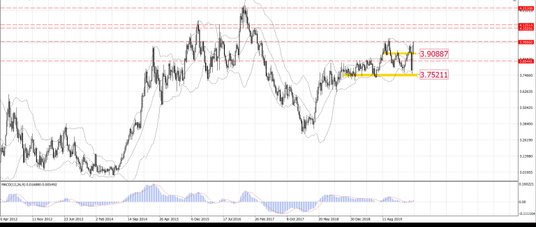 „Ostatnie decyzje banków centralnych i wypowiedzi ich prezesów są paliwem dla zmienności dla większości par walutowych. Wyjątkiem nie jest USD/PLN, który w obrębie siedmiu dni został przeceniony o 25 groszy. Ostatnia deprecjacja PLN rozpoczęła się od ceny 3,75. Seria białych świec nie zareagowała na opór 3,85 oraz 3,90. Ten drugi poziom w dniu wczorajszym stał się trampoliną dla kolejnego wzrostu, tym samym zamieniając się we wsparcie. Doprowadziło to do testu równej wartości 4,00. Dalsze wzrosty są możliwe, choć ich skala sugeruje chwilowy odpoczynek przy bieżących szczytach. W takim przypadku korekta może sprowadzić PLN z powrotem do wsparcia znajdującego się 10 groszy niżej lub nawet dotknąć 3,85. MACD powrócił do wartości dodatnich, co informuje, że układ szybkich średnich kroczących skierowany jest na północ. Sugeruje to możliwość ataku na strefę 4,10 – 4,12. Małym pocieszeniem dla posiadaczy krótkich pozycji jest układ wstęg Bollingera, gdzie górna linia tego wskaźnika wyznaczająca zakres zmienności, pokrywa się z aktualnymi wartościami USD/PLN. Rozpiętość stref jest w zakresie 5 groszy, ale dynamika ruchu ceny przeskakuje przez nie, jakby to był interwał H1, a nie tygodniowy. Dopóki zmienność nie wróci do swoich normalnych zakresów, częściej należy zaglądać na wysokie interwały" – analizuje Śliwa.
