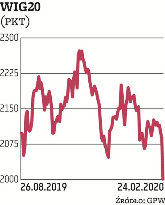 Tak nisko nie był notowany od ponad trzech lat. Krajowe indeksy poruszały się zgodnie z kierunkiem wyznaczonym przez zagraniczne rynki akcji, na których zdecydowanie więcej do powiedzenia mieli sprzedający. Fala wyprzedaży objęła azjatyckie i europejskie parkiety, by na koniec zawitać za ocean. Głównym powodem pogorszenia nastrojów były rosnące obawy inwestorów, związane ze skutkami globalnego rozprzestrzeniania się koronawirusa. Alarm z powodu epidemii ogłosiły kolejne kraje, m.in. Korea Południowa i Włochy.