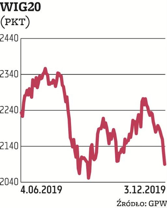 Dzienne minimum wyniosło 2088 pkt. Jest to najniższy poziom od 3 października, co oznacza, że po jesiennej hossie nie ma już śladu. We wtorkowe popołudnie 5 z 20 blue chips notowało spadek kursu przekraczający 3 proc. Najgorzej zachowywał się Lotos, z przeceną sięgającą 4,8 proc. Ponad 2 proc. traciły też PZU i Pekao, co ma związek z politycznymi zmianami kadrowymi w banku. Na drugim biegunie były spółki energetyczne – PGE i Tauron, których papiery drożały o ponad 1 proc.