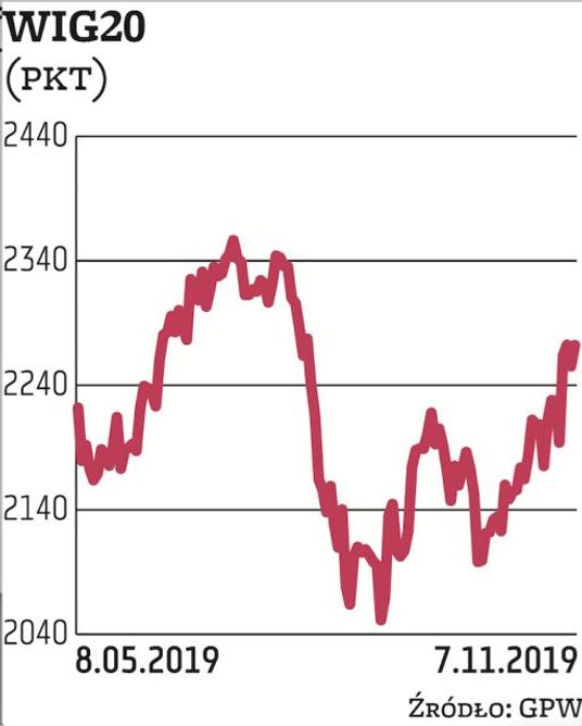WIG20 zaczął sesję luką wzrostową, a po kilku minutach rósł o 1 proc., do 2277 pkt. Ta ostatnia wartość okazała się dziennym maksimum. Później bowiem przyszła mała realizacja zysków, a notowania indeksu weszły w trend boczny, poruszając się do końca dnia 0,6–0,75 proc. nad kreską. Gorzej było z segmentem „misiów", bowiem zarówno mWIG40, jak i sWIG80 oddały po południu cały poranny dorobek. Potwierdził się więc fakt, że czynniki o charakterze globalnym napędzają głównie blue chips, w których udział kapitału zagranicznego jest największy. Czwartkowa sesja wpisuje się w przypadku WIG20 i mWIG40 w trwające od początku października odbicie, którego skala jest coraz bardziej obiecująca. W ciągu ostatnich 25 sesji ten pierwszy zyskał 8,2 proc., a drugi 5,1 proc. W odniesieniu do maluchów na razie o odbiciu mowy być nie może, gdyż zmiana wynosi zaledwie 0,8 proc.