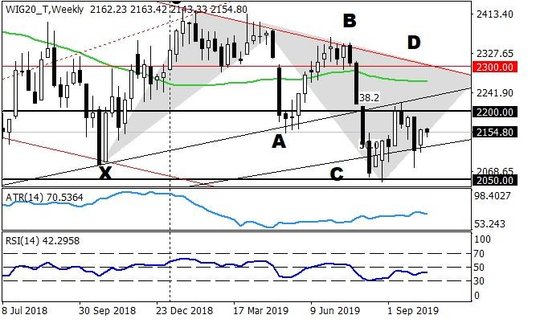 Z punktu widzenia techniki Wig20 nadal znajduje się w impulsie wzrostowym w odcinku |CD|, czytanym w układzie tygodniowym. Ma więc przed sobą barierę 2200 punktów, ale też wsparcie 2050 punktów. Podlega zależnościom horyzontalnym wg SMA-50 a do tego jest pod presją przełamanego dołka 2162 pkt. oraz spadkowej, klasycznej linii trendu z ostatnich nieco ponad 90 tygodni handlu. To czyni wymiany w Wig20 mocno rotacyjne, gdyż bieżący stan indeksu odpowiada na wielu spółkach układami bocznymi lub boksowaniem się z zależnościami rynku niedźwiedzia. Niskie poziomy tygodniowego RSI (14) rzędu 42 punktów pokazują motywację drugiej strony transakcji, więc kontrariańsko niskie wartości indeksu Wig20 zbiegają się z relatywnie niskimi ww. poziomami RSI. To oznacza, że wg tygodniowej zmienności rzędu 70 punktów możliwe są wahania Wig20 o nawet 100 – 140 punktów.