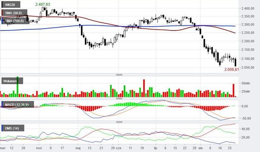 Niestety nic takiego nie ma miejsca. Na półmetku środowej sesji WIG20 spadał o 1,9 proc. do 2054 pkt a więc o 1 pkt pogłębił tegoroczne minimum. Na wykresie tworzy się spadkowa świeca z dużym korpusem i jeśli tak zostanie do końca dnia, będzie to sygnał do kontynuacji wyprzedaży i zejścia na nowe dołki. Duży, czarny korpus widoczny jest też na wykresie mWIG40. Notowania indeksu spadały o 1,2 proc. do 3700 pkt. To najniższy poziom od kwietnia 2016 r. Relatywnie najlepiej radzi sobie sWIG80. Jego kurs spadał tylko o 0,2 proc. do 11 520 pkt i cały czas broni położonego 20 pkt niżej wsparcia. Warto zauważyć, że WIG20 był na półmetku sesji najsłabszym indeksem na giełdowej mapie Europy. Dla porównania – DAX tracił tylko 0,8 proc., a BUX 0,4 proc.