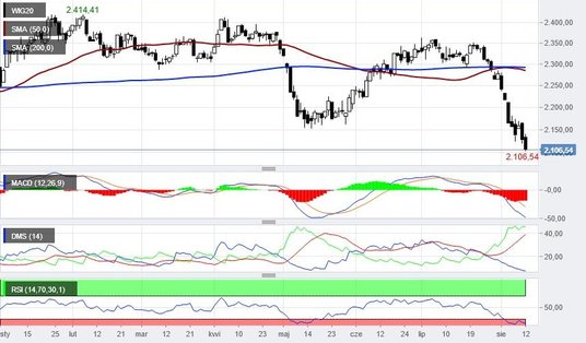 Na warszawskiej giełdzie nie ma dziś wielkich obrotów, bo tuż po godzinie 15-stej wynosiły zaledwie 300 mln zł. Nie przeszkadza to jednak niedźwiedziom w utrzymaniu przewagi rynkowej. WIG20 spadał po południu o ponad 1 proc. do 2104 pkt, co oznacza, że wyznaczył nowy, tegoroczny dołek. Segment dużych spółek jest bardzo mocno wyprzedany, o czym świadczy nie tylko niski poziom kursu, ale także MACD przyjmujący już wartość -48 pkt oraz RSI(14) sięgający poziomu 22 pkt. Warto zauważyć, że notowania zbliżają się do ubiegłorocznego dołka – 2082 pkt. Okolice tego poziomu można traktować jako potencjalne wsparcie i byki będą miału tutaj okazję do wyprowadzenia wzrostowej kontry. Dziś ratunkiem może być okrągłe 2100 pkt, choć wiele zależeć będzie od nastrojów zagranicznych. Jeśli WIG20 zakończy sesję pod kreską, będzie to oznaczać, że na osiem ostatnich, dziennych świec, tylko jedna była wzrostowa. Niestety, ale kiepski finisz poniedziałku jest możliwy, bowiem kontrakty na WIG20 traciły 1,3 proc. i notowane były po 2090 pkt. Ponadto sesja na Wall Street zaczęła się od spadków S&P500 i Nasdaq odpowiednio o 0,7 proc. i 0,8 proc.